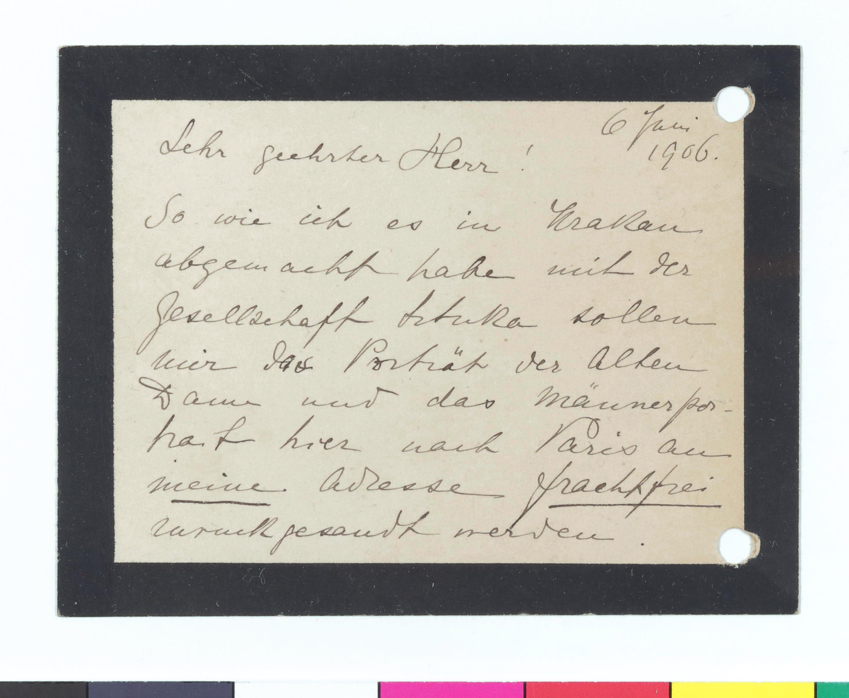 Bekanntgabe von Rücksendeadressen für zwei ihrer Werke, 1906