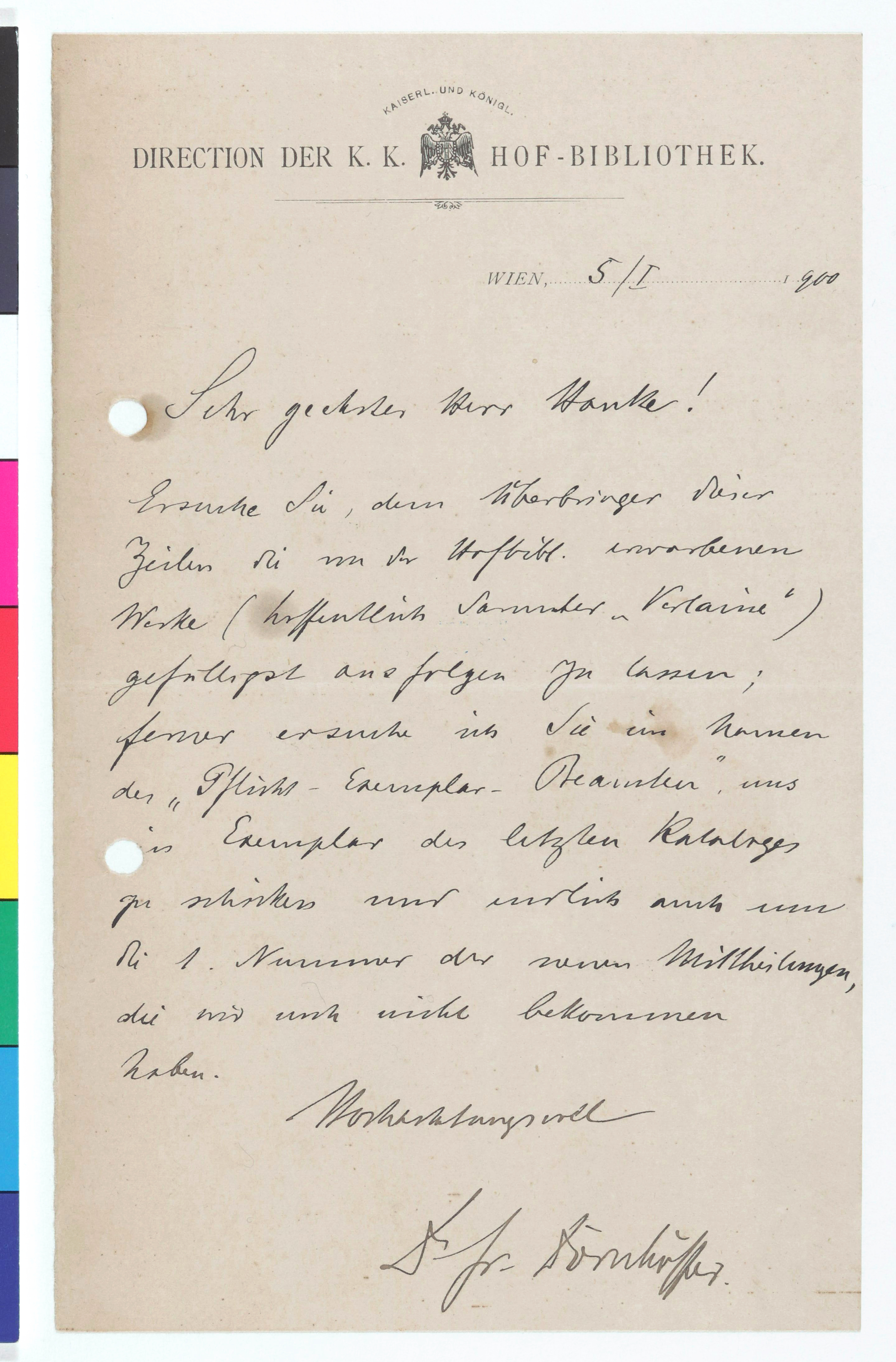 Bitte um Zusendung der erworbenen Werke sowie einiger Publikationen, 1900