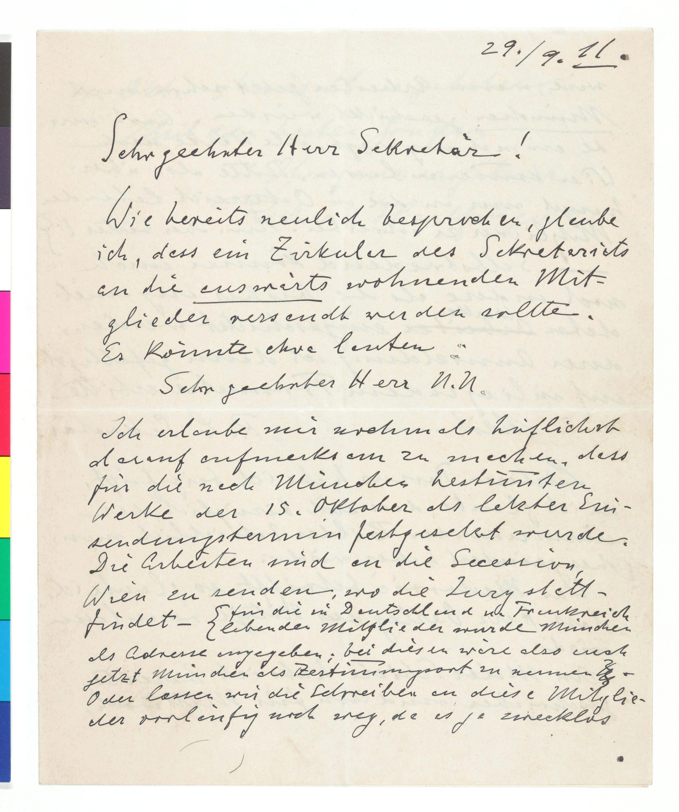 Vorschlag zu einer Benachrichtigungen an die Mitglieder bezüglich des Einsendetermins für München, 1911