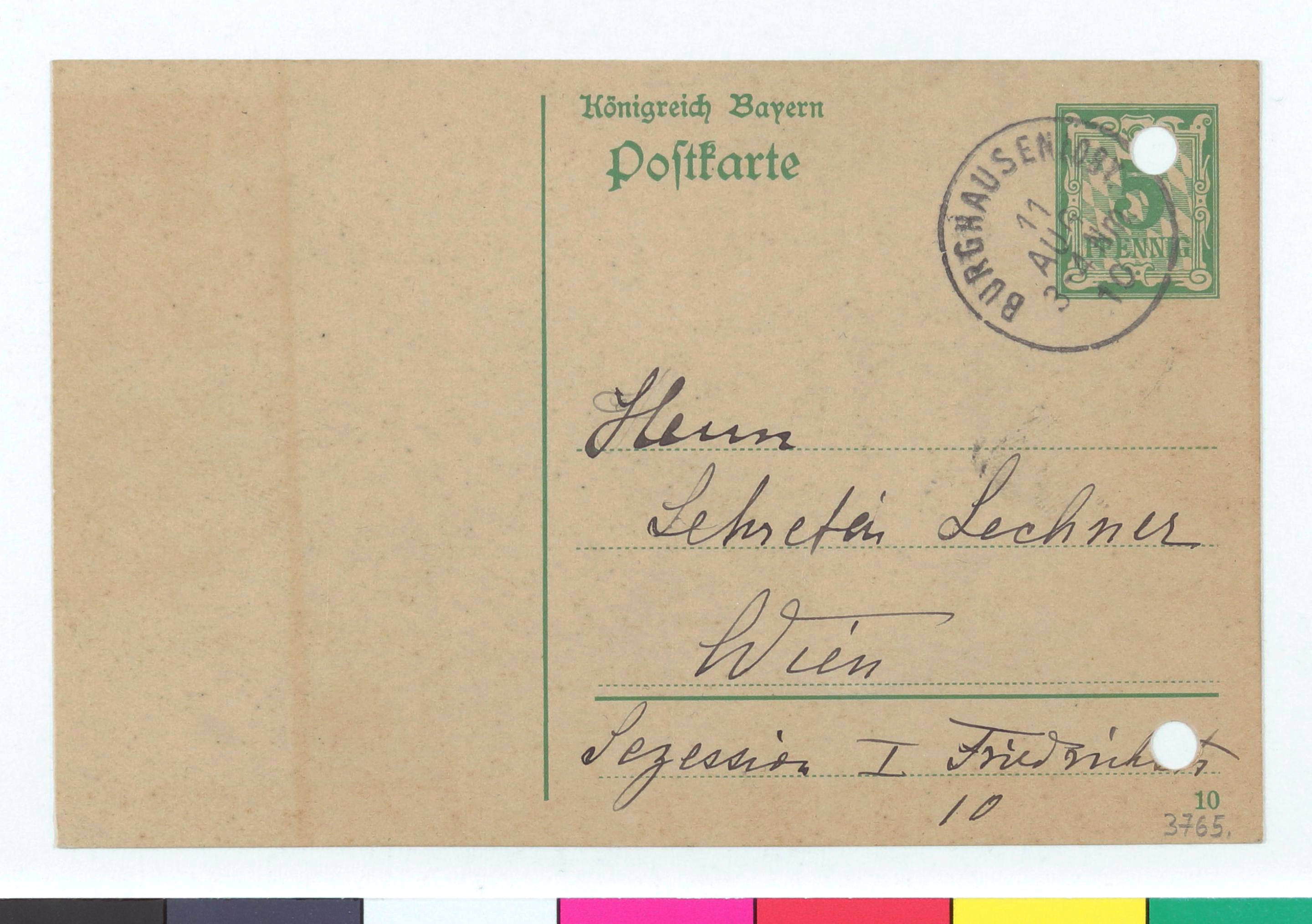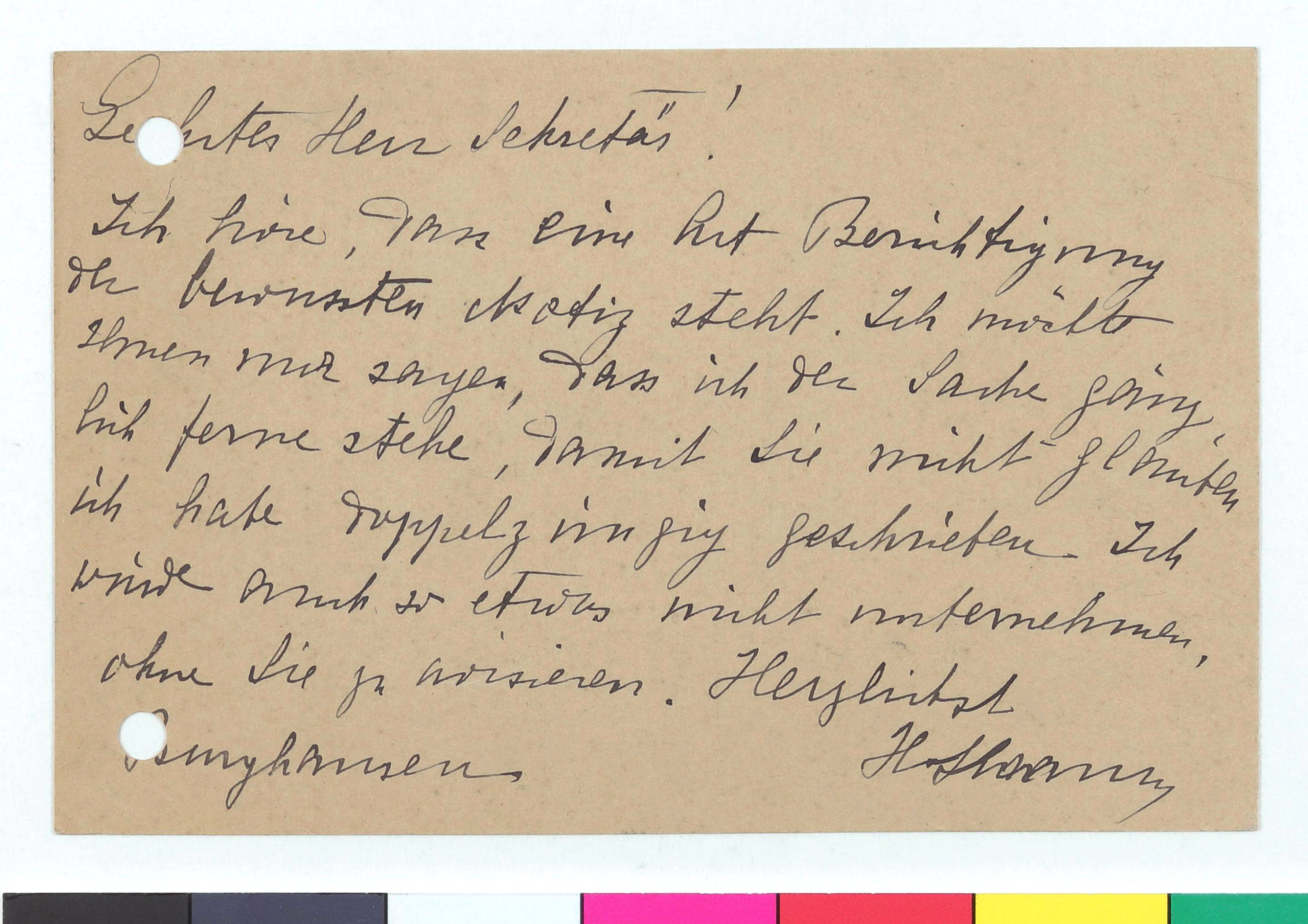 Nach dem sie/er von der Berichtigung „der bewussten Notiz" gehört hat, wird dem Sekretär der Secession versichert, dass man der Sache gänzlich ferne stehe „damit Sie nicht glauben ich habe doppelzüngig geschrieben".