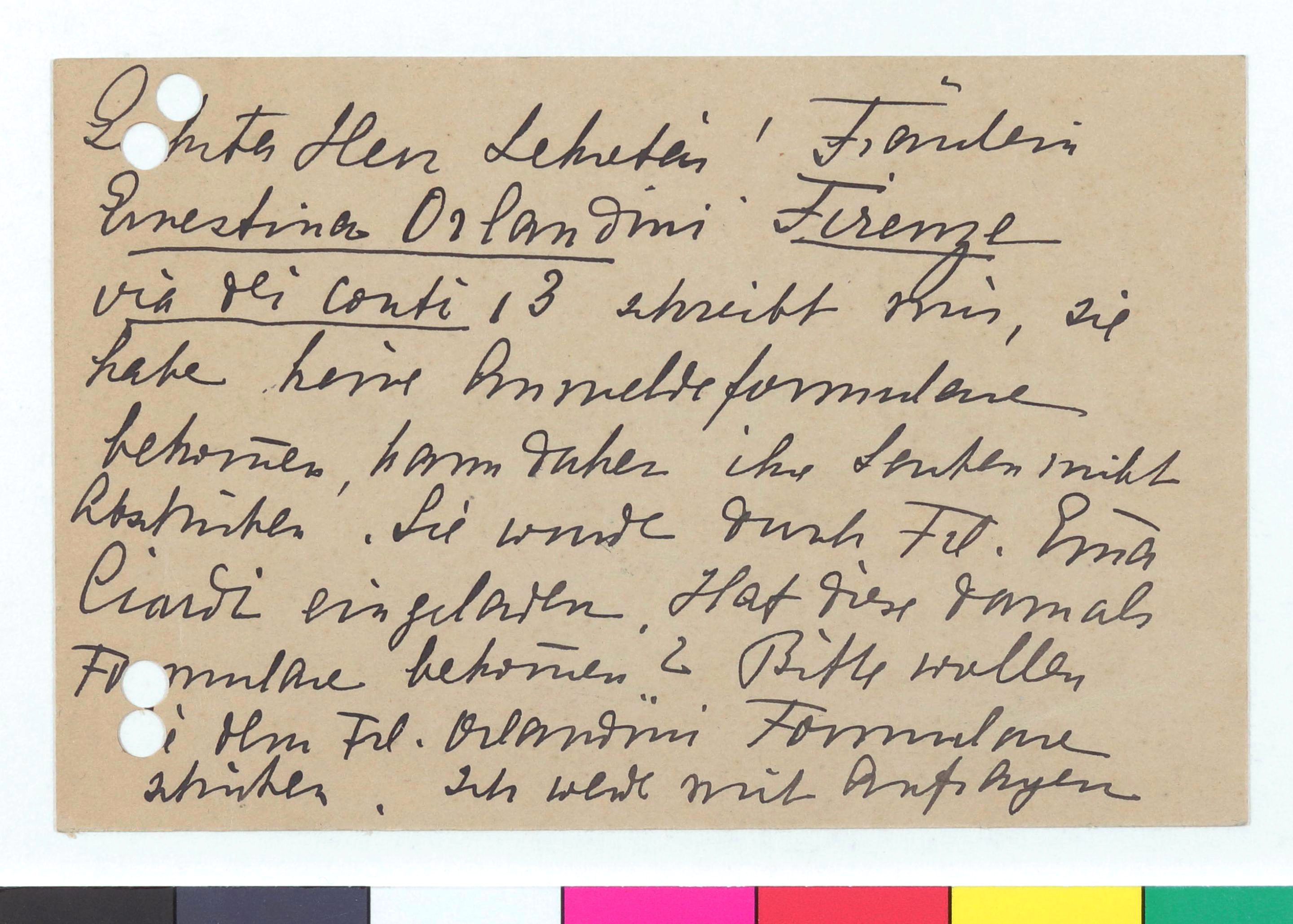 Bitte um Zusendung desfehlender Anmeldebogens für Ernestina Orlandini, 1910