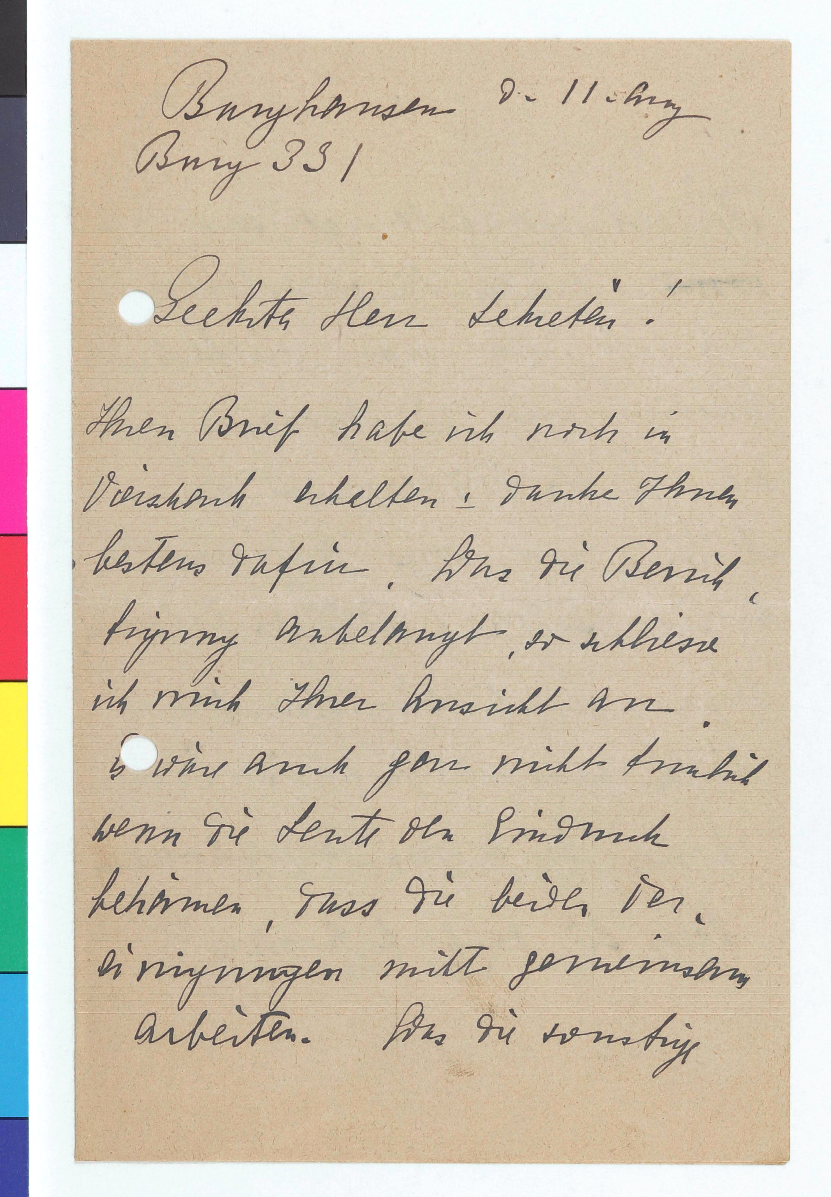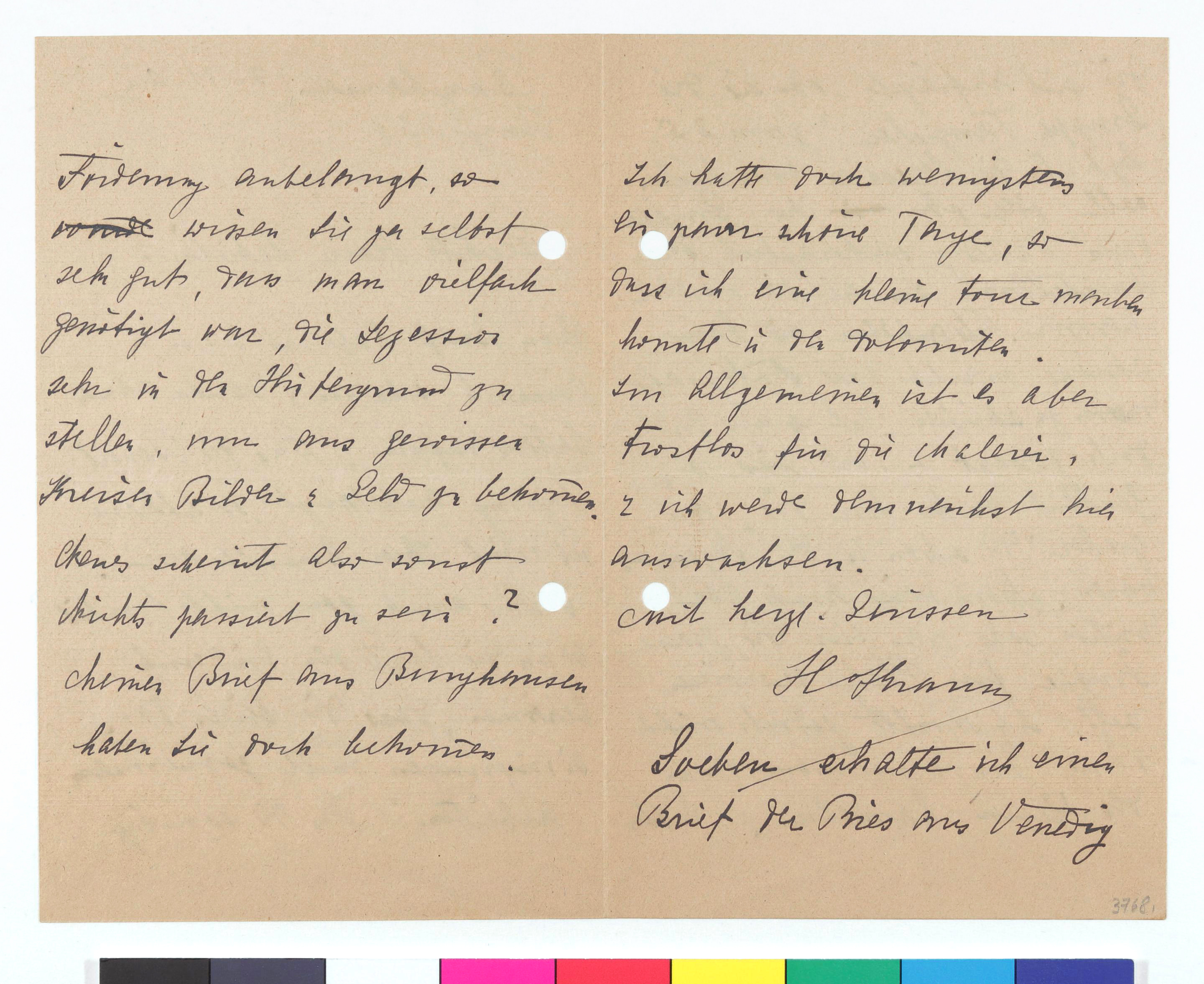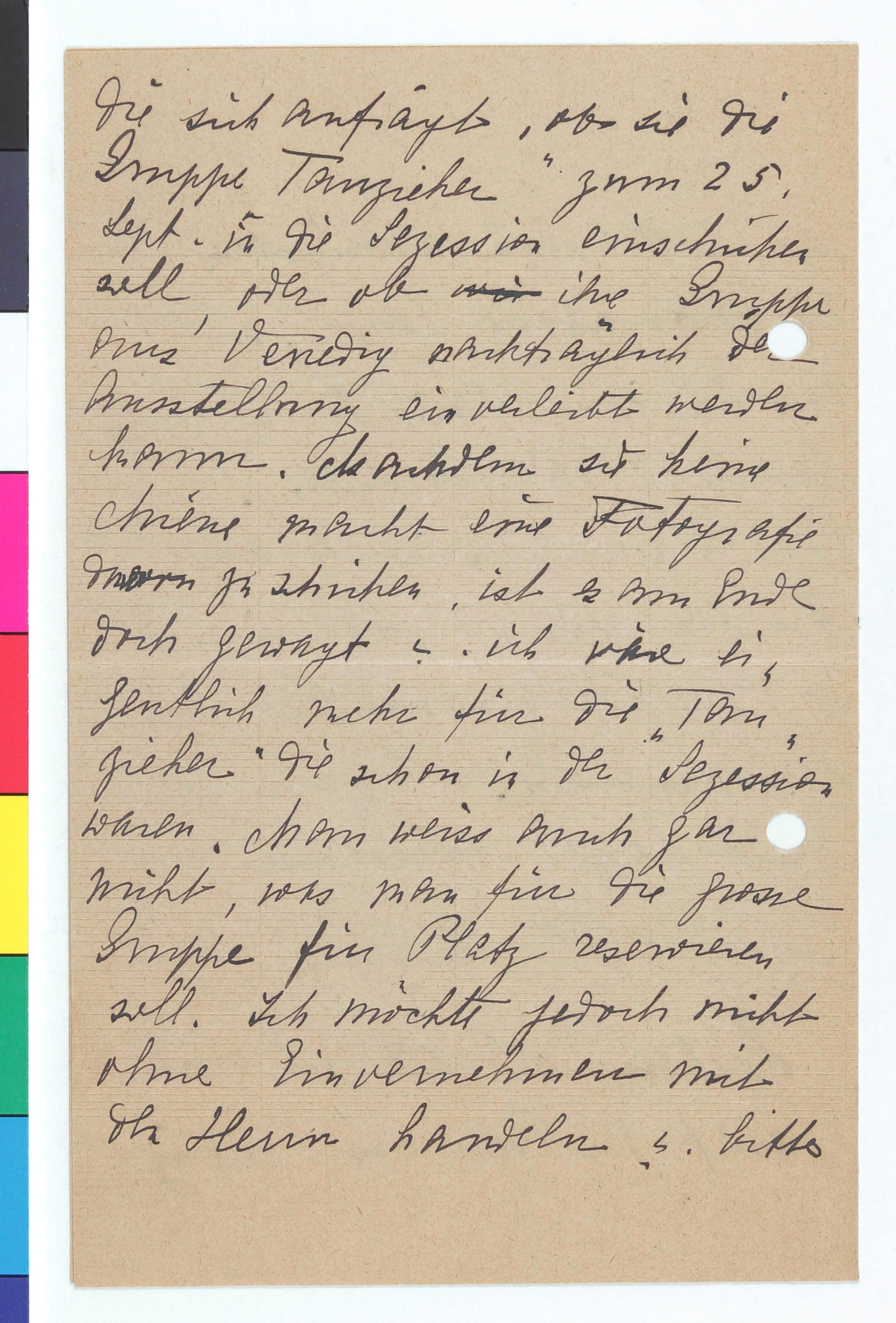 Der/die Schreiber*in schließt sich der Meinung des Sekretärs der Secession, Rudolf Lechner, an. Ansonsten wisse dieser ja recht gut, dass man vielfach genötigt gewesen sei, die Secession in den Hintergrund zu stellen, um aus gewissen Kreisen Bilder und Geld zu bekommen. Soeben sei ein Brief von Ries [Teresa Feodorowna Ries] eingetroffen und es stelle sich nun die Frage, ob die Gruppe „Tauzieher" aus Venedig eingeschickt werden solle.