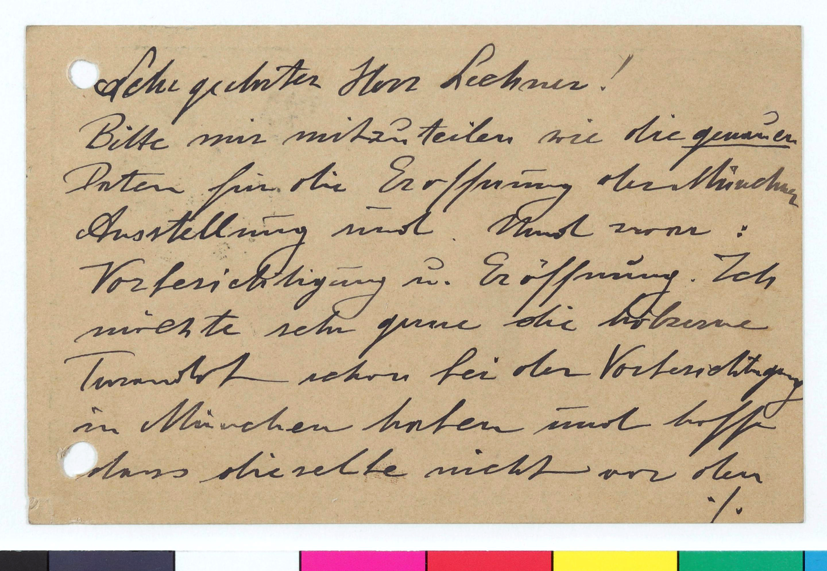 Anfrage an den Sekretär der Secession zu den genauen Daten für die Eröffnung der Münchner Ausstellung. Möglicher Zusammenhang, doch keine nachweisbare Beteiligung Alfred Hofmanns wäre die Münchener Winterausstellung 1912.