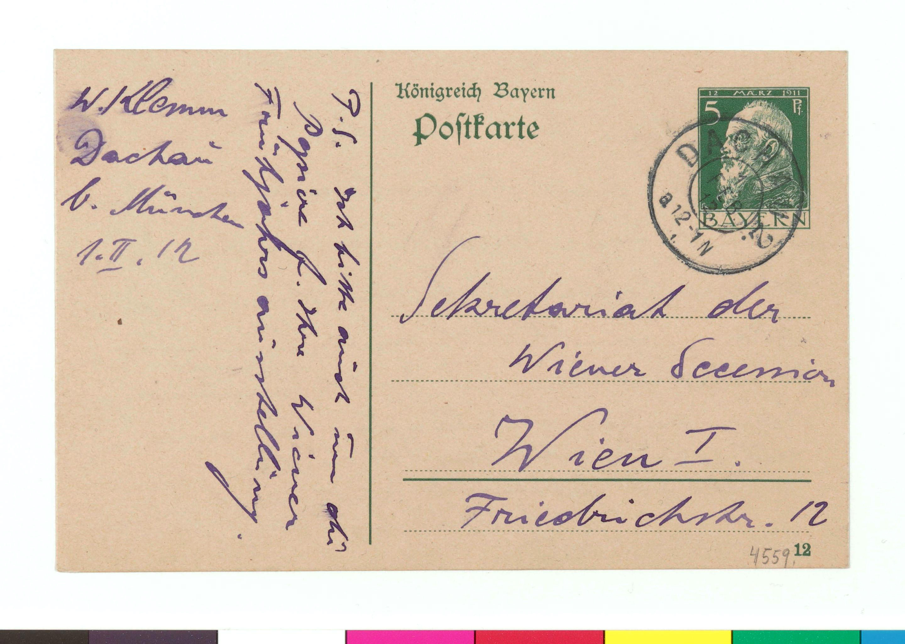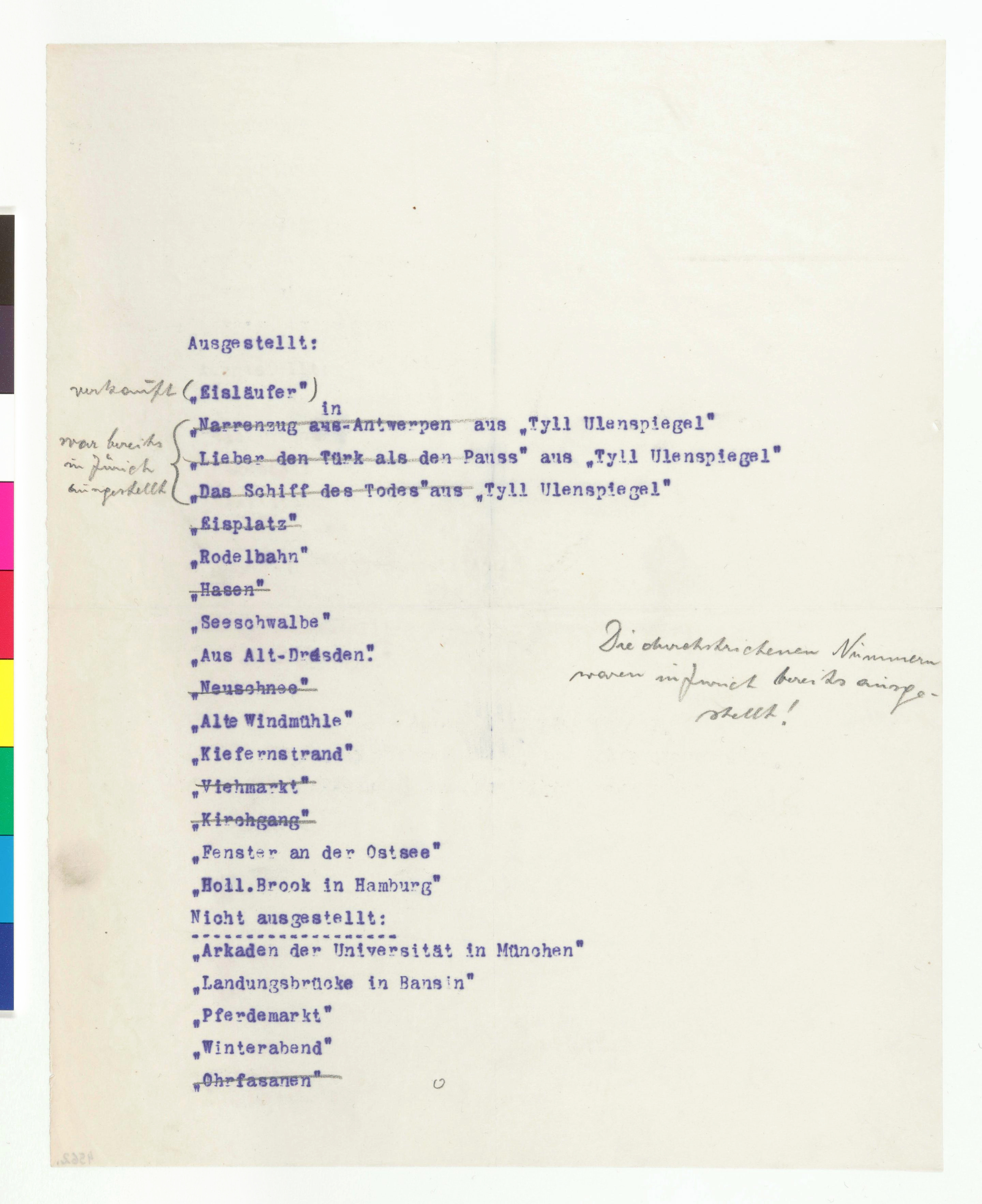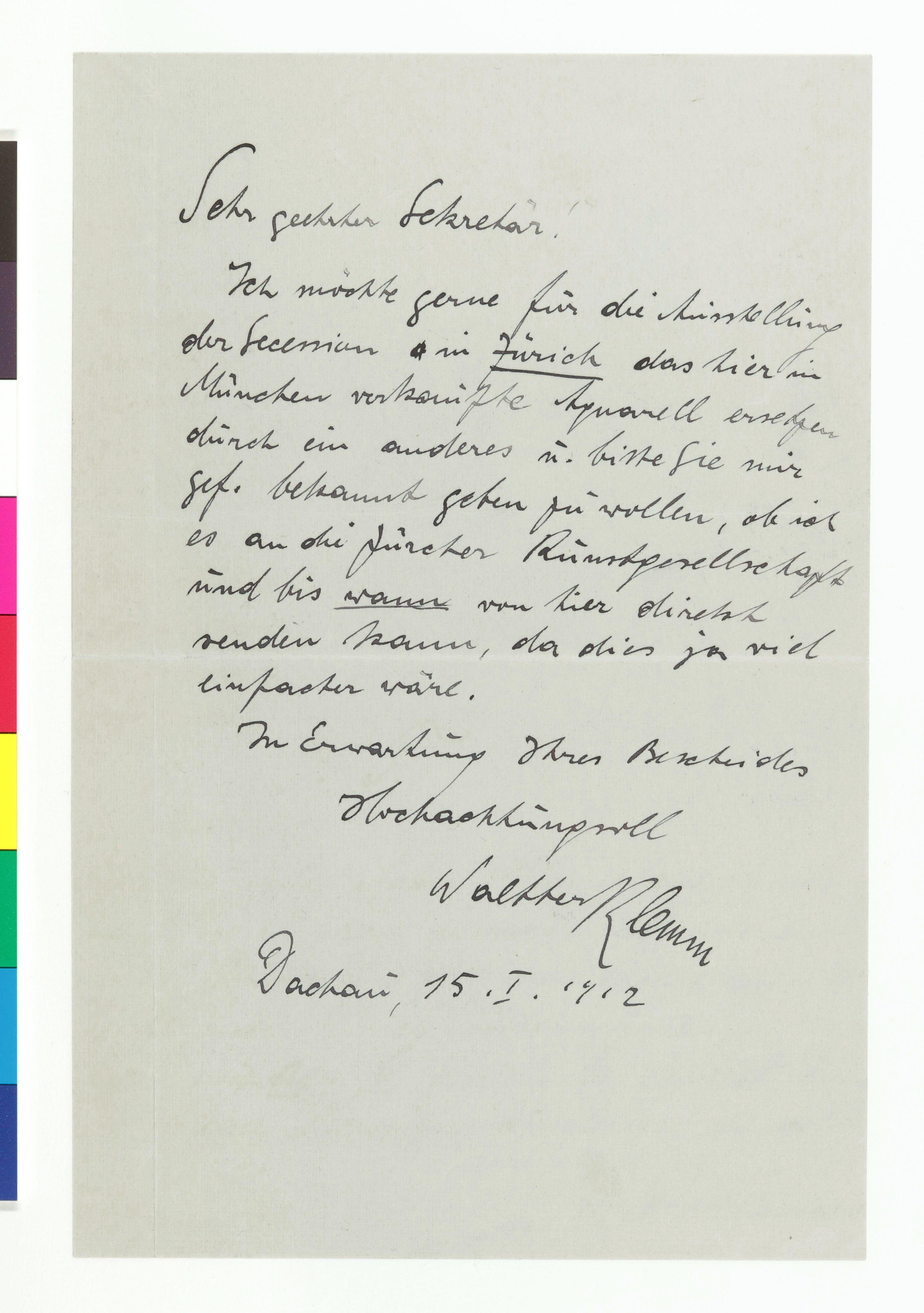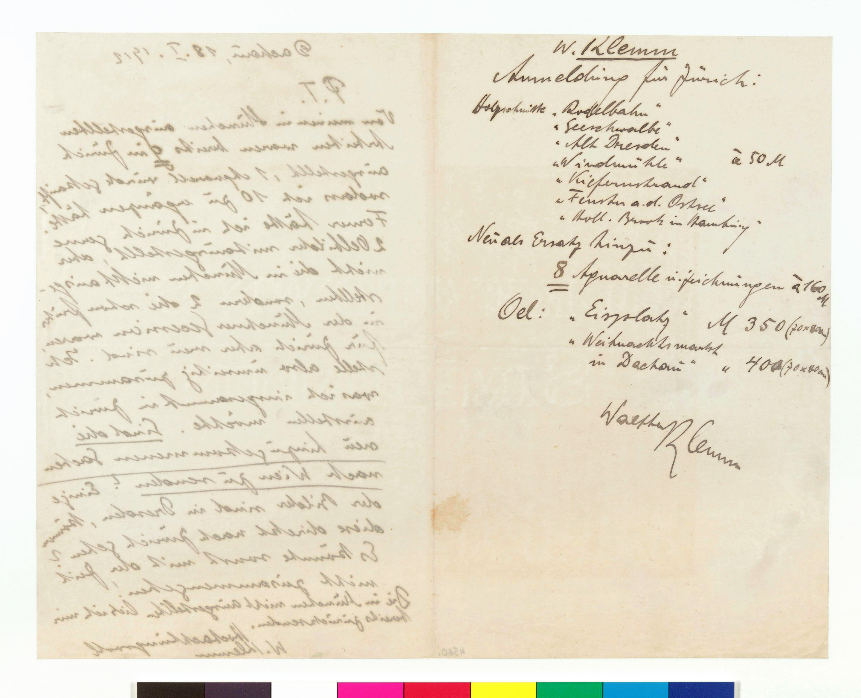 Werkliste von Walther Klemm für die Ausstellung im Kunsthaus Zürich, 1912