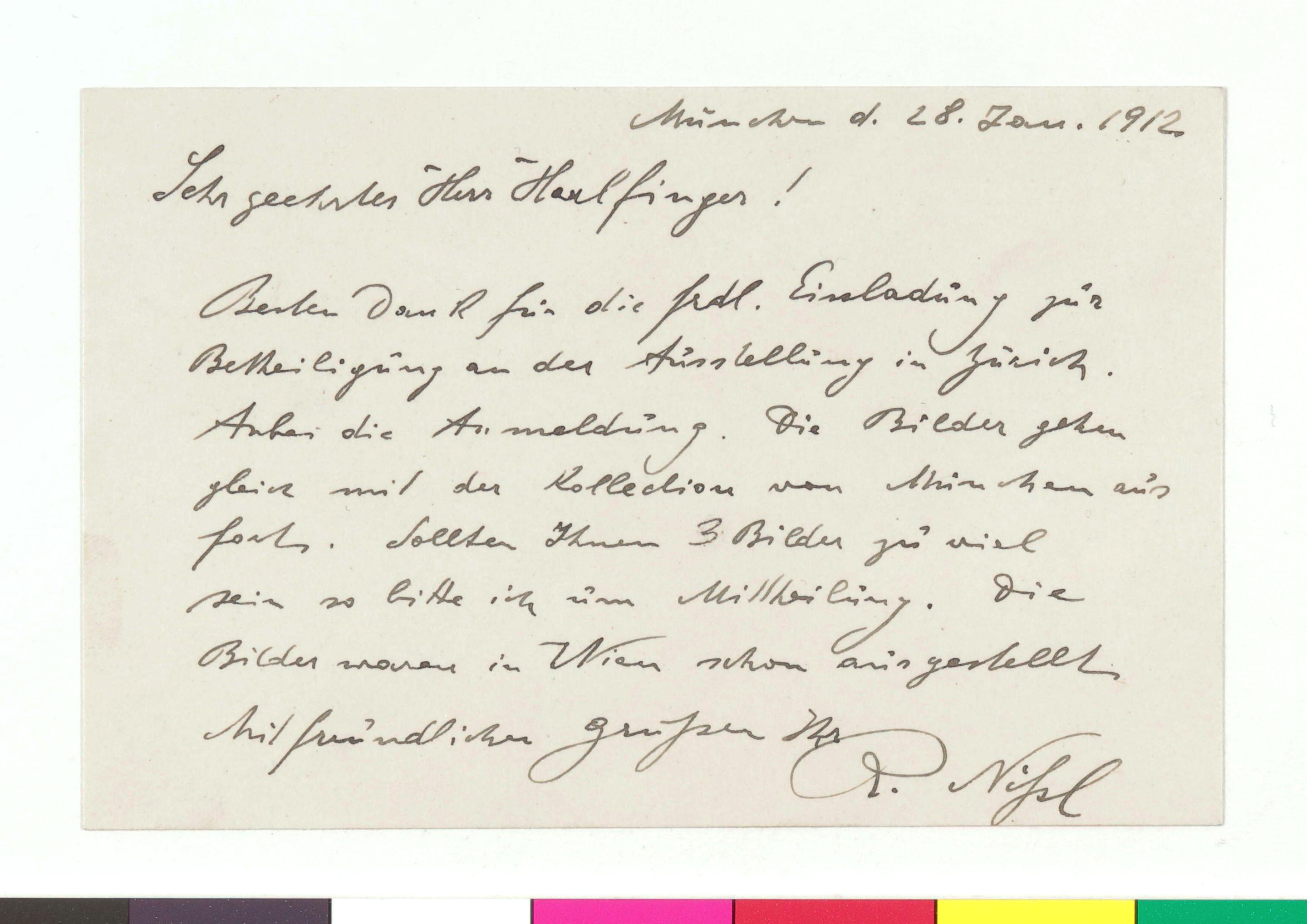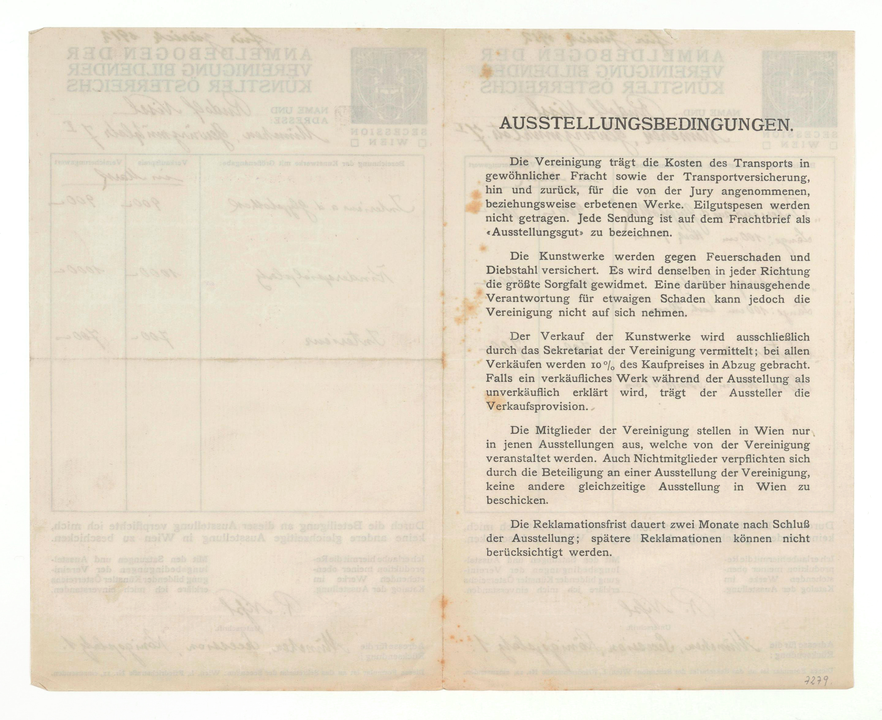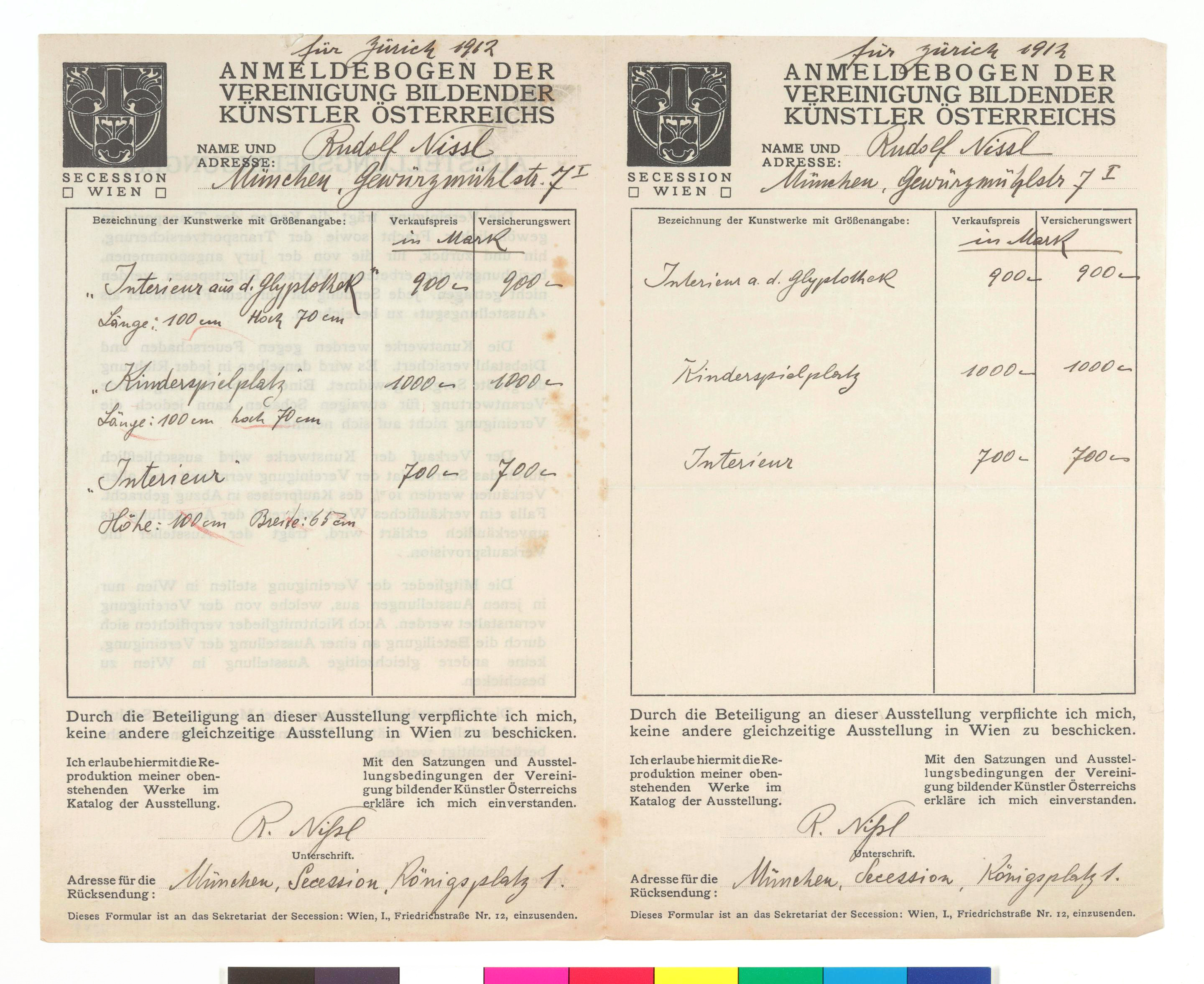 Anmeldebogen für die Ausstellung der Wiener Secession im Kunsthaus Zürich, 1912