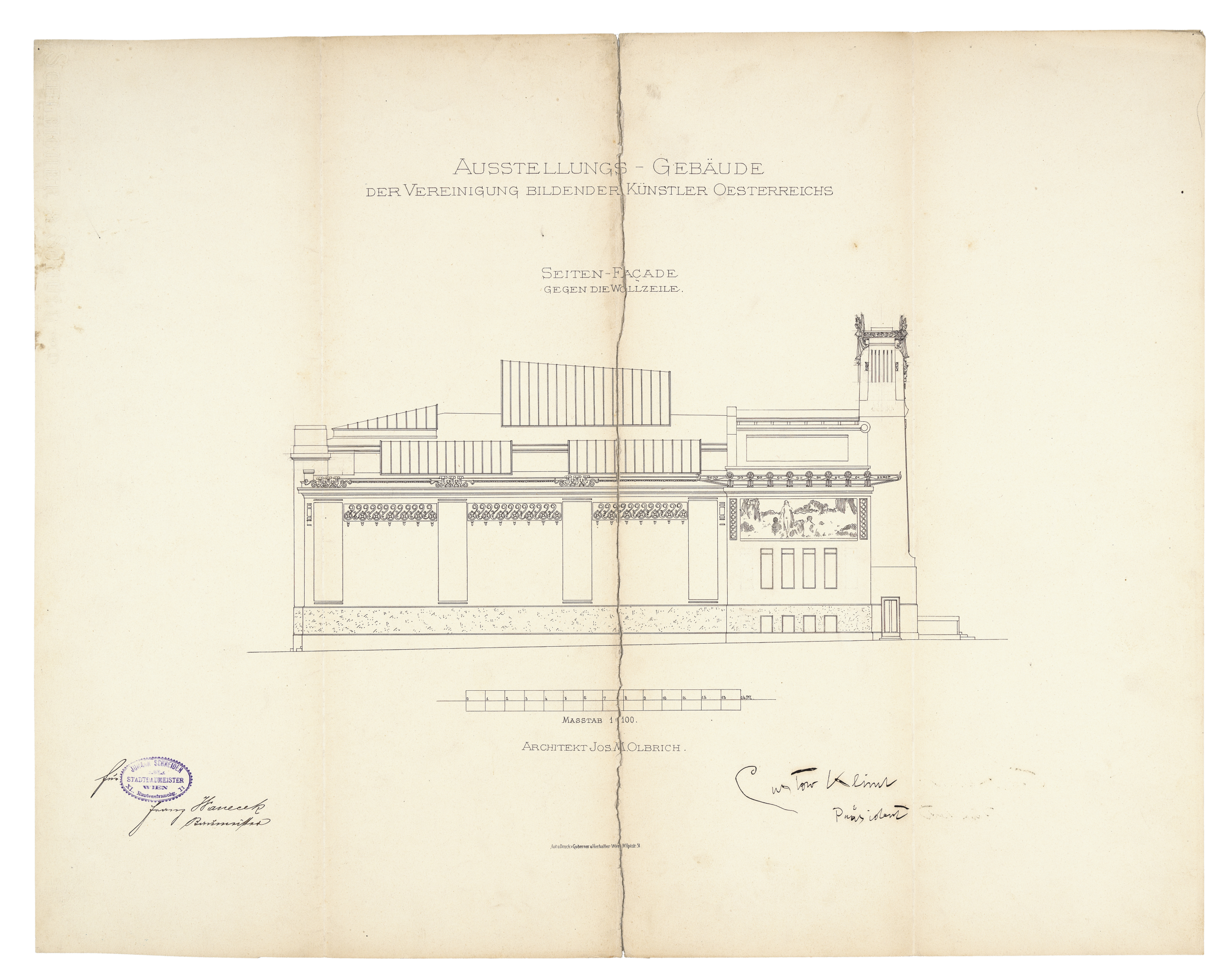 l. u.: handschriftlich: “für (Stempel: Johann Schneider Stadtbaumeister) Franz Hanecek Baumeister“; r. u. handschriftlich: “Gustav Klimt Präsident“