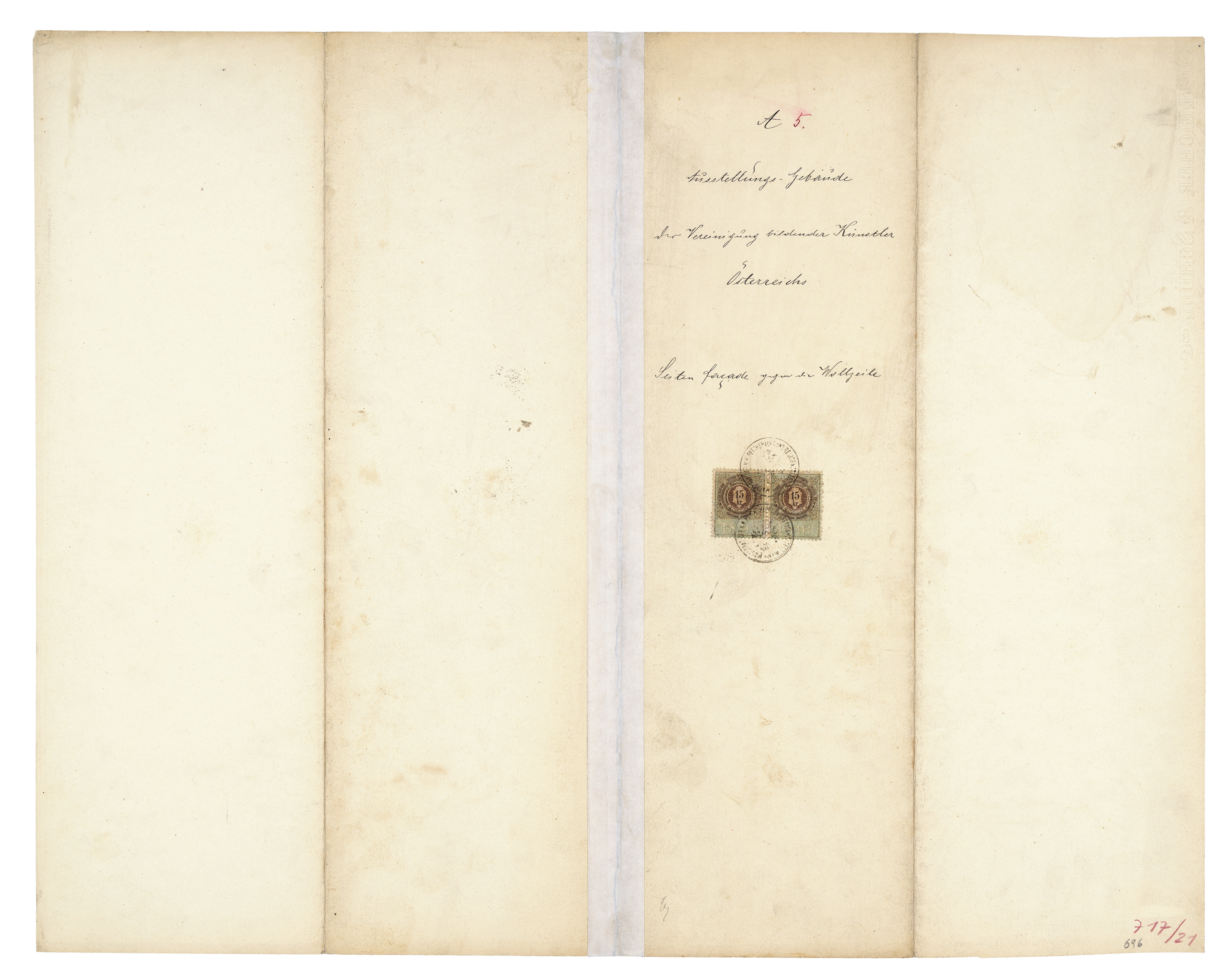 handschriftlich: "A 5. Ausstellungs.Gebäude der Vereinigung bildender Künstler Österreichs Seiten Facade gegen die Wollzeile“; 2 Stempelmarken 1893