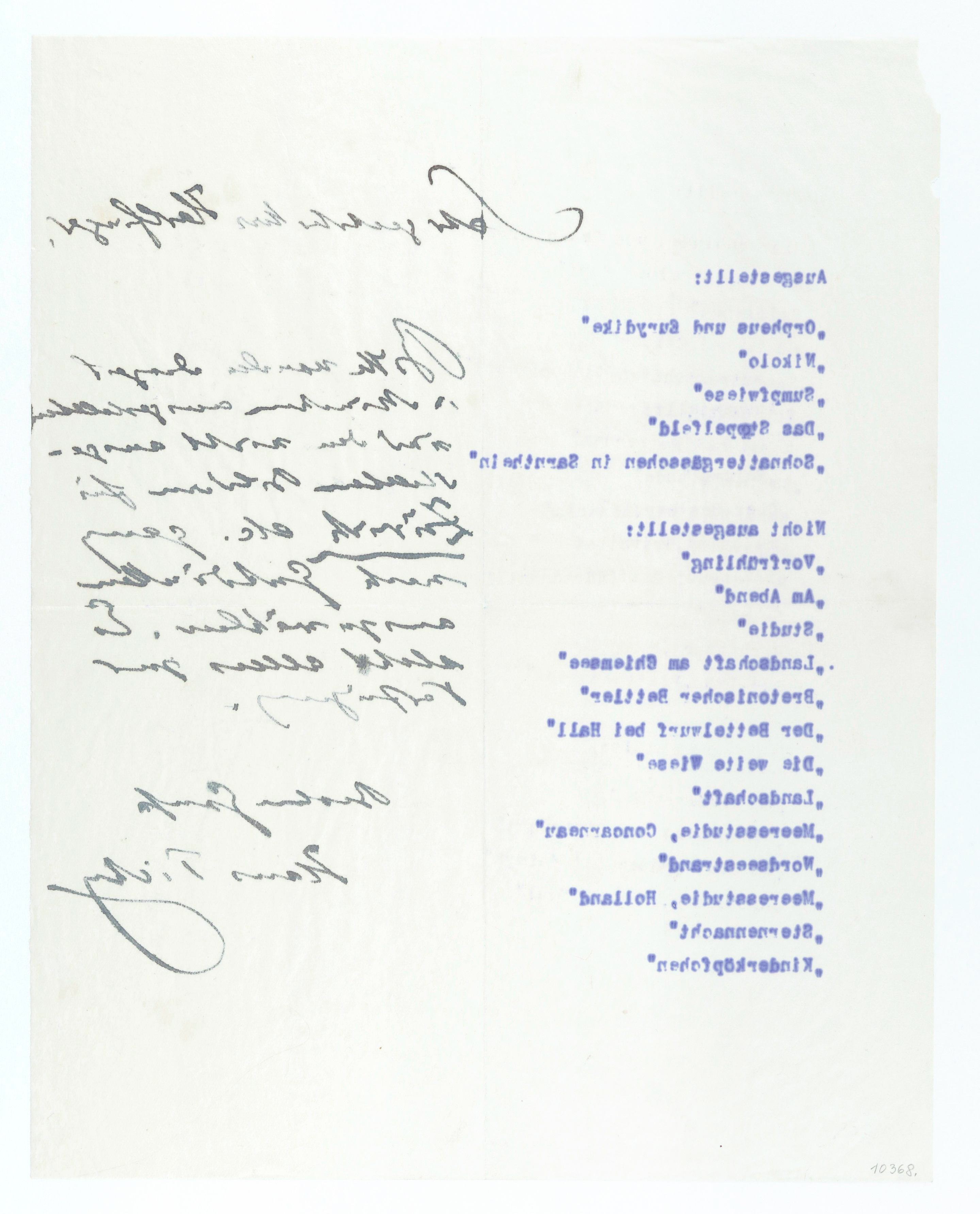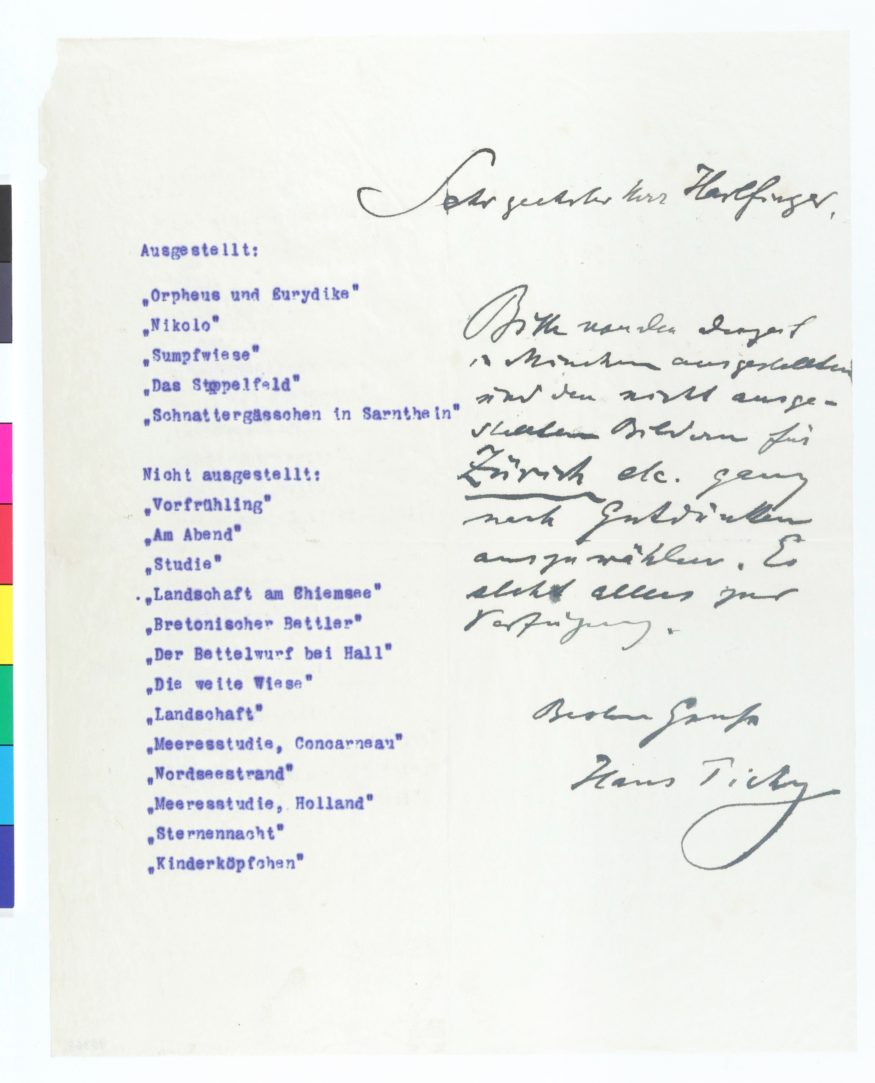 Liste mit handschriftlicher Notiz von Hans Tichy, gerichtet an Richard Harlfinger