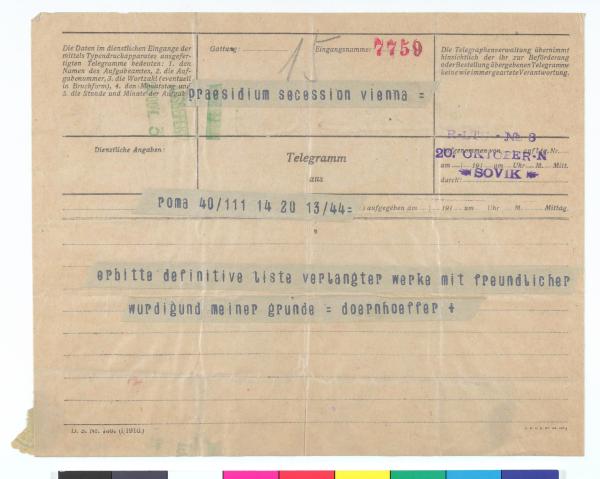 Telegramm von der K.k. Hof-Bibliothek an die Secession