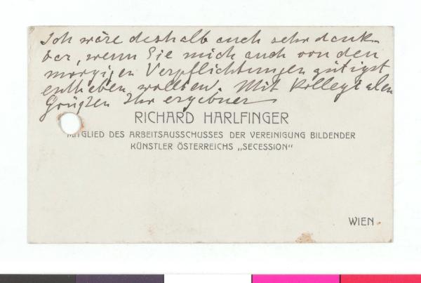 Visitenkarte von Richard Harlfinger mit handschriftlicher Notiz, gerichtet an Josef Engelhart