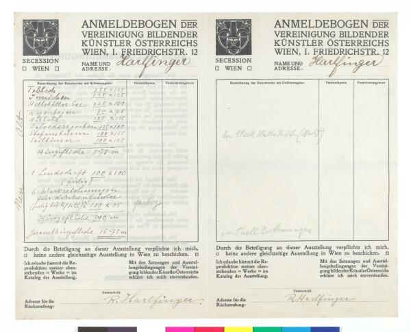 Anmeldebogen (vermutlich) für die Winter-Ausstellung in München, 1911