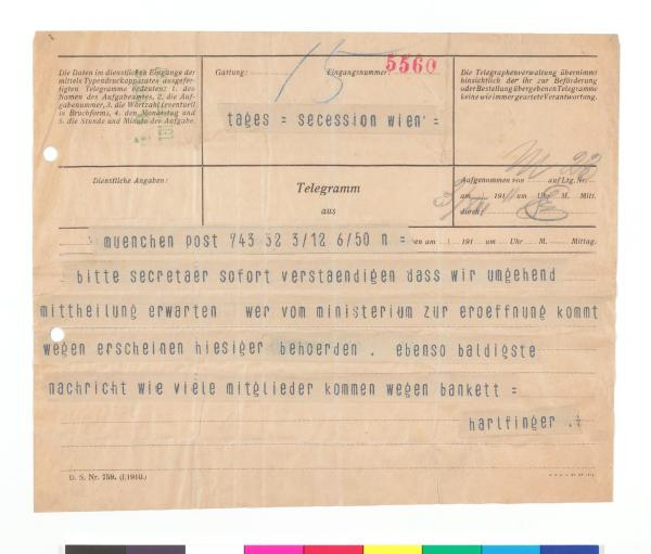 Telegramm von Richard Harlfinger an die Secession
