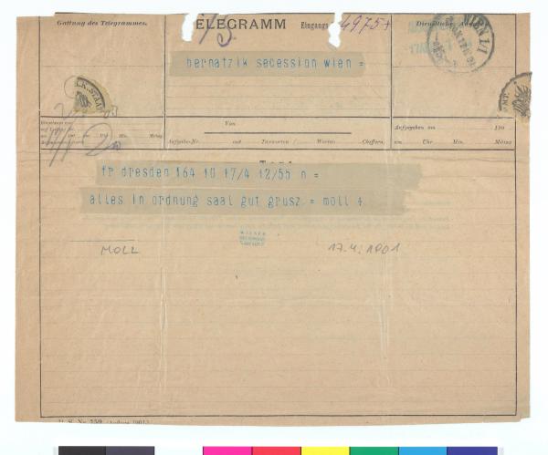 Telegramm von Carl Moll an Wilhelm Bernatzik