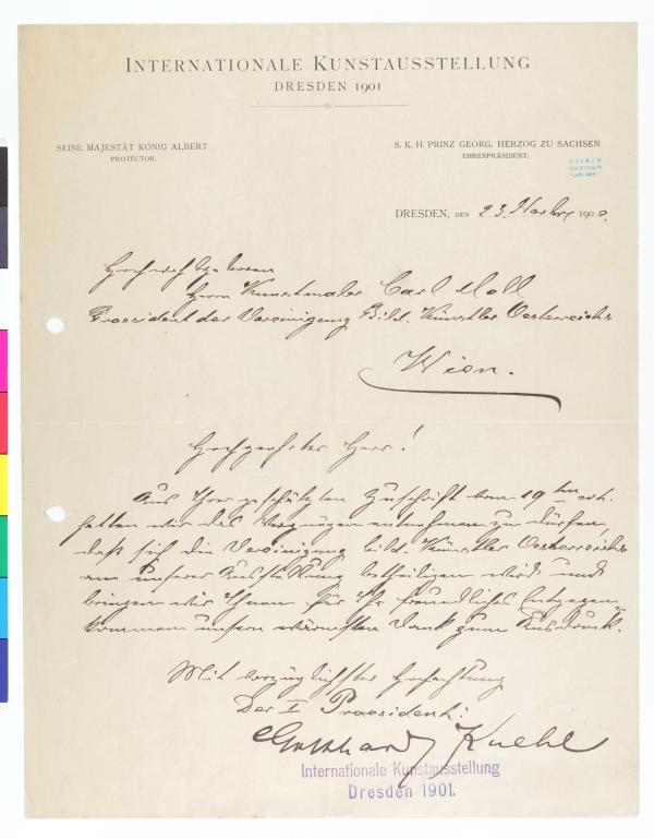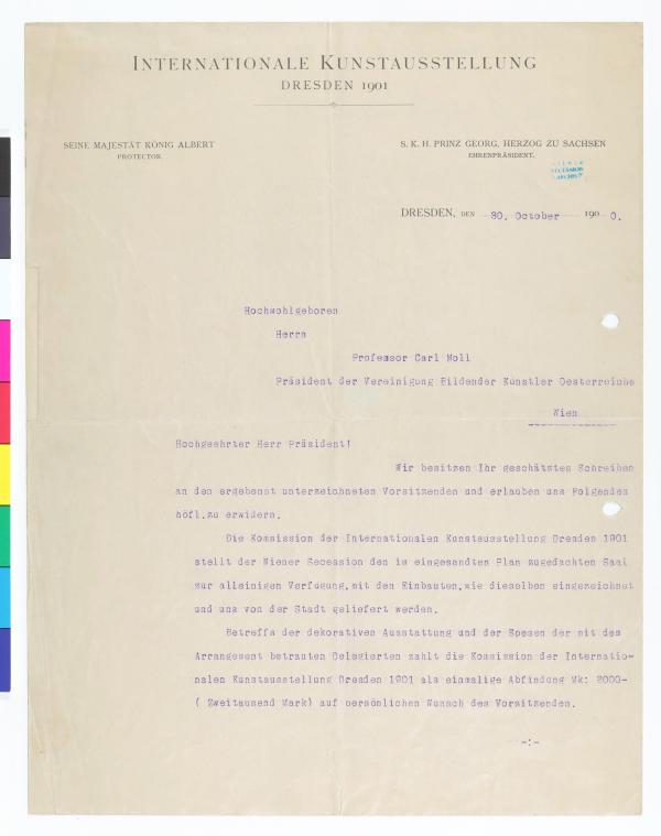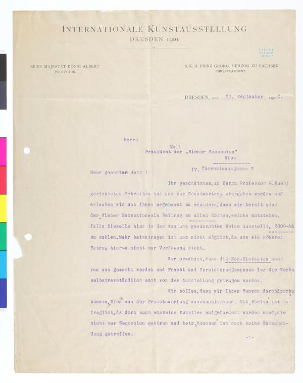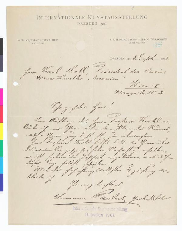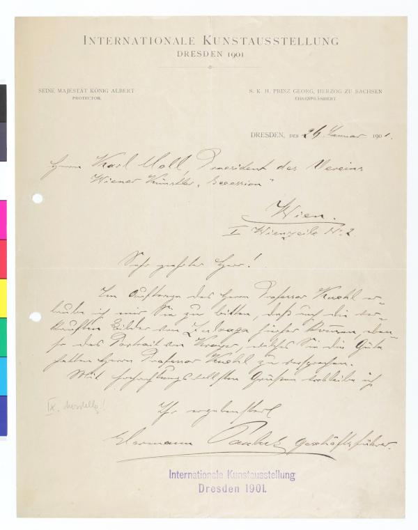 Brief vom Organisationsbüro der Internationalen Kunstausstellung Dresden 1901 an die Secession