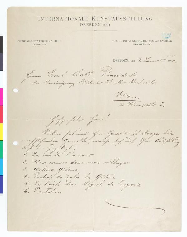 Zusage Ignacio Zuloagas, ausgewählte Arbeiten in Dresden zu zeigen, 1901
