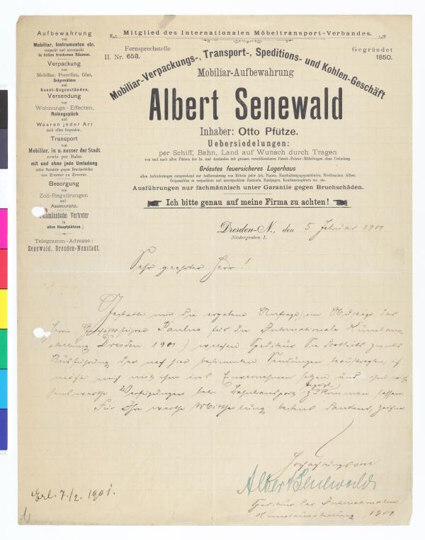 Brief von der Spedition Albert Senewald an die Secession
